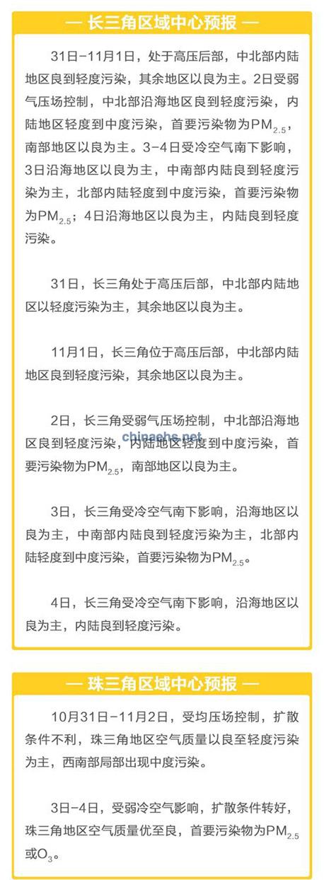 31日-11月2日,西南大部空氣質量優(yōu)良,局地可能出現(xiàn)輕度污染;東北、華北、華東、華南和西北以良至輕度污染為主,東北和西北局地以及華北中南部可能出現(xiàn)中度污染,其中11月1日京津冀中南部局地可能出現(xiàn)重度污染。